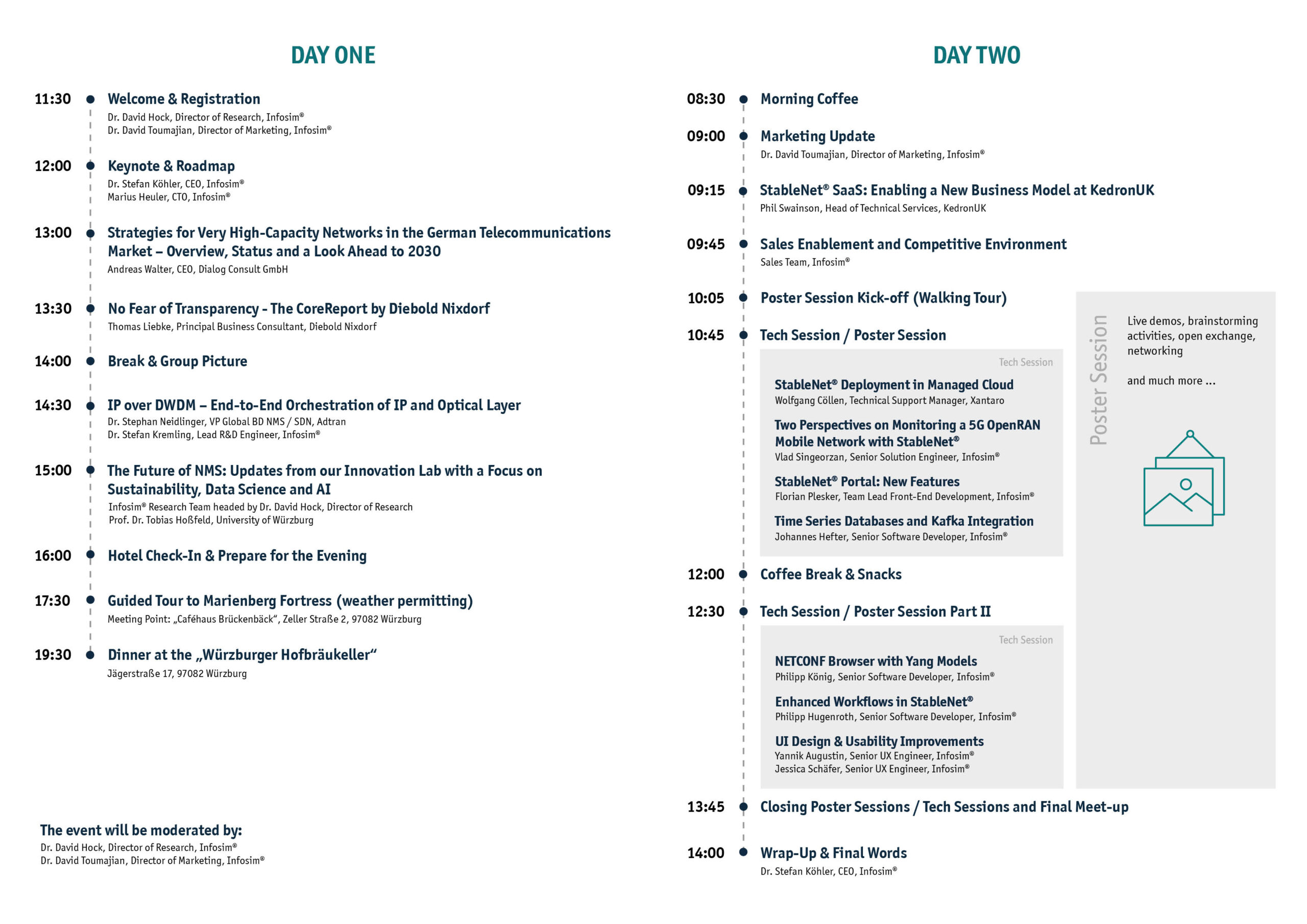 Please note that the evening program will include a guided tour to and around the Marienberg Fortress. This walking tour includes some moderate up-hill sections as well as stairs. We are happy to offer alternative transport for this. If you require transport or would prefer not to take part in the tour, please let us know using the registration form or send us an email to marketinghq@infosim.net.